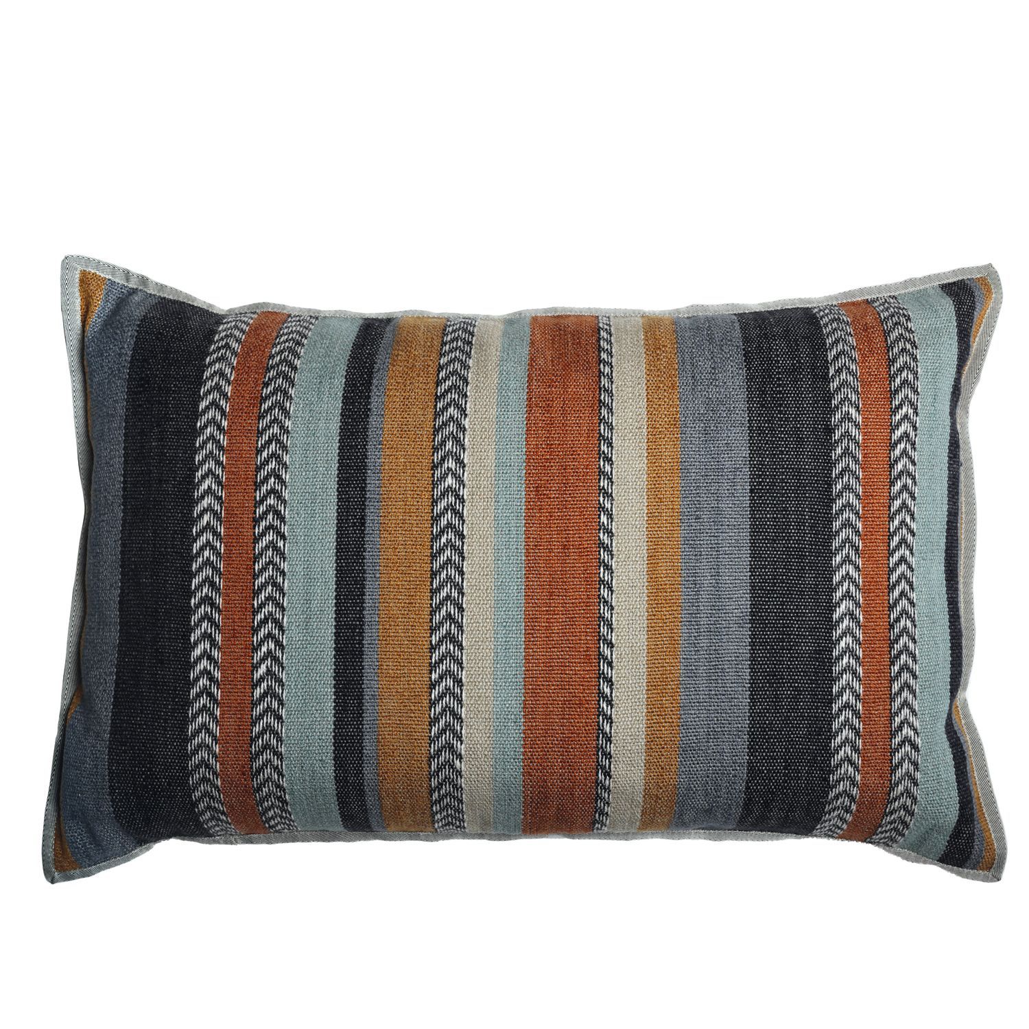 A large rectangular cushion with coloured stripes in a luxurious, jute and linen blend fabric. Co-ordinated with a natural coloured, plain linen on the reverse and piping. All Casamance cushions come complete with a feather filled inner pad.