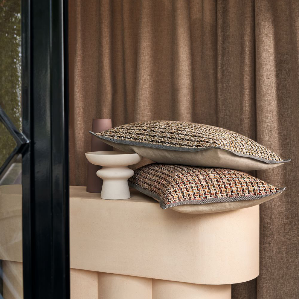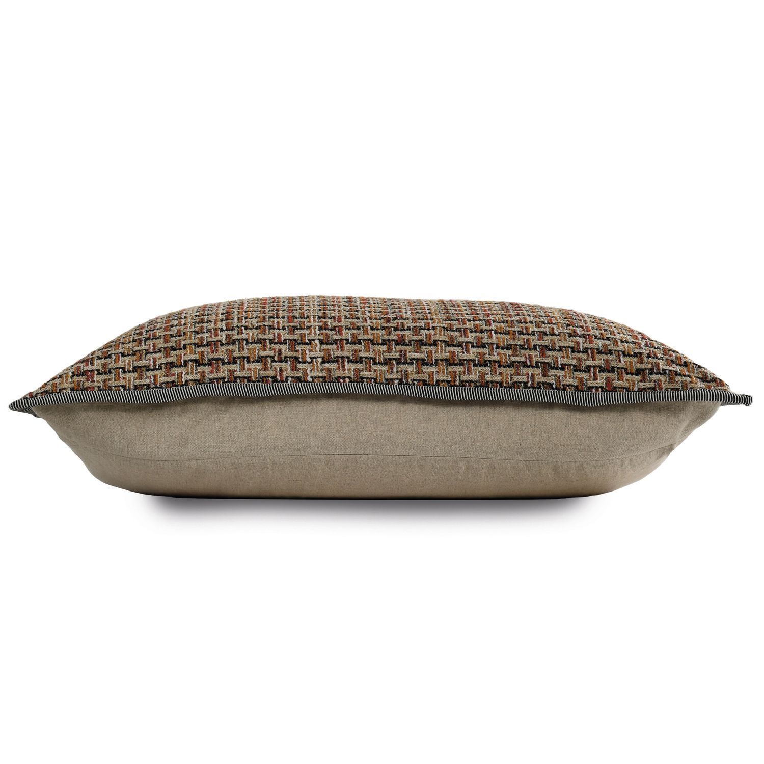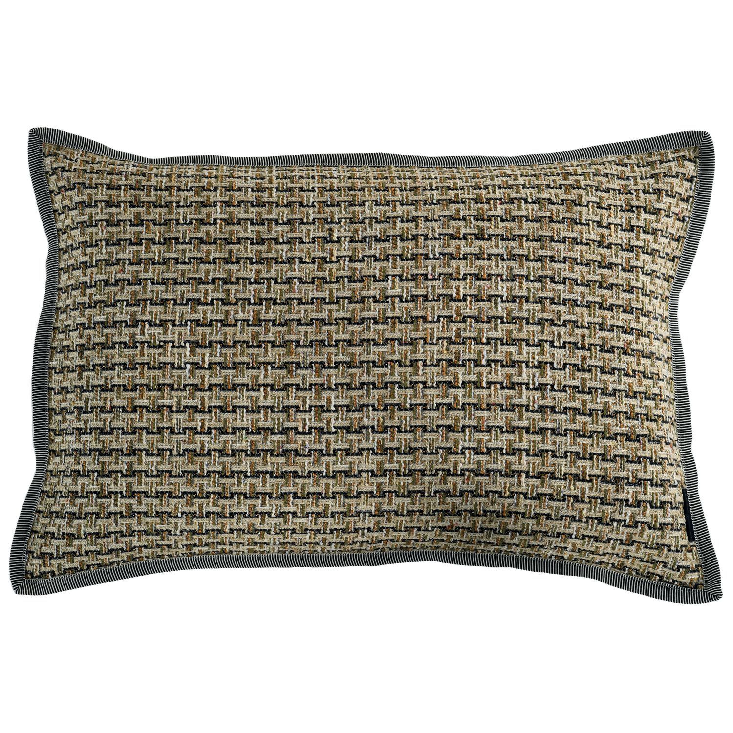 A large rectangular cushion in a braided fabric in a subtle geometric weave. Co-ordinated with a natural coloured, plain linen on the reverse and braided piping. All Casamance cushions come complete with a feather filled inner pad.