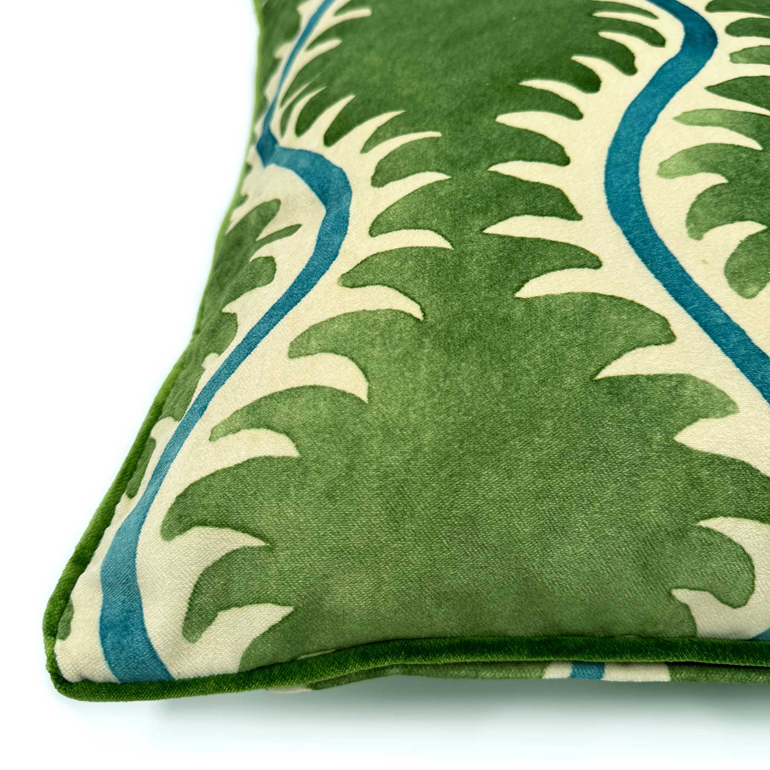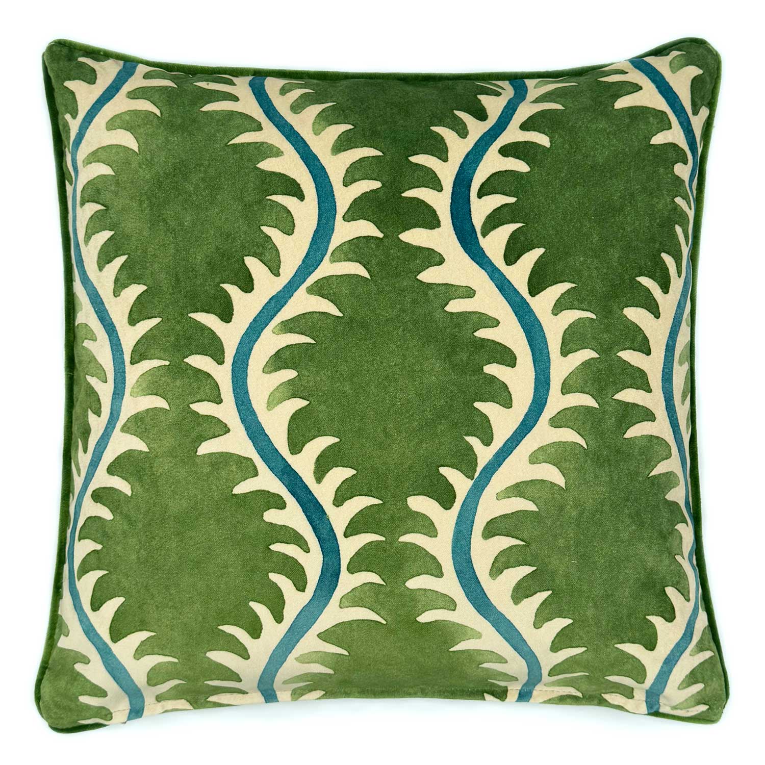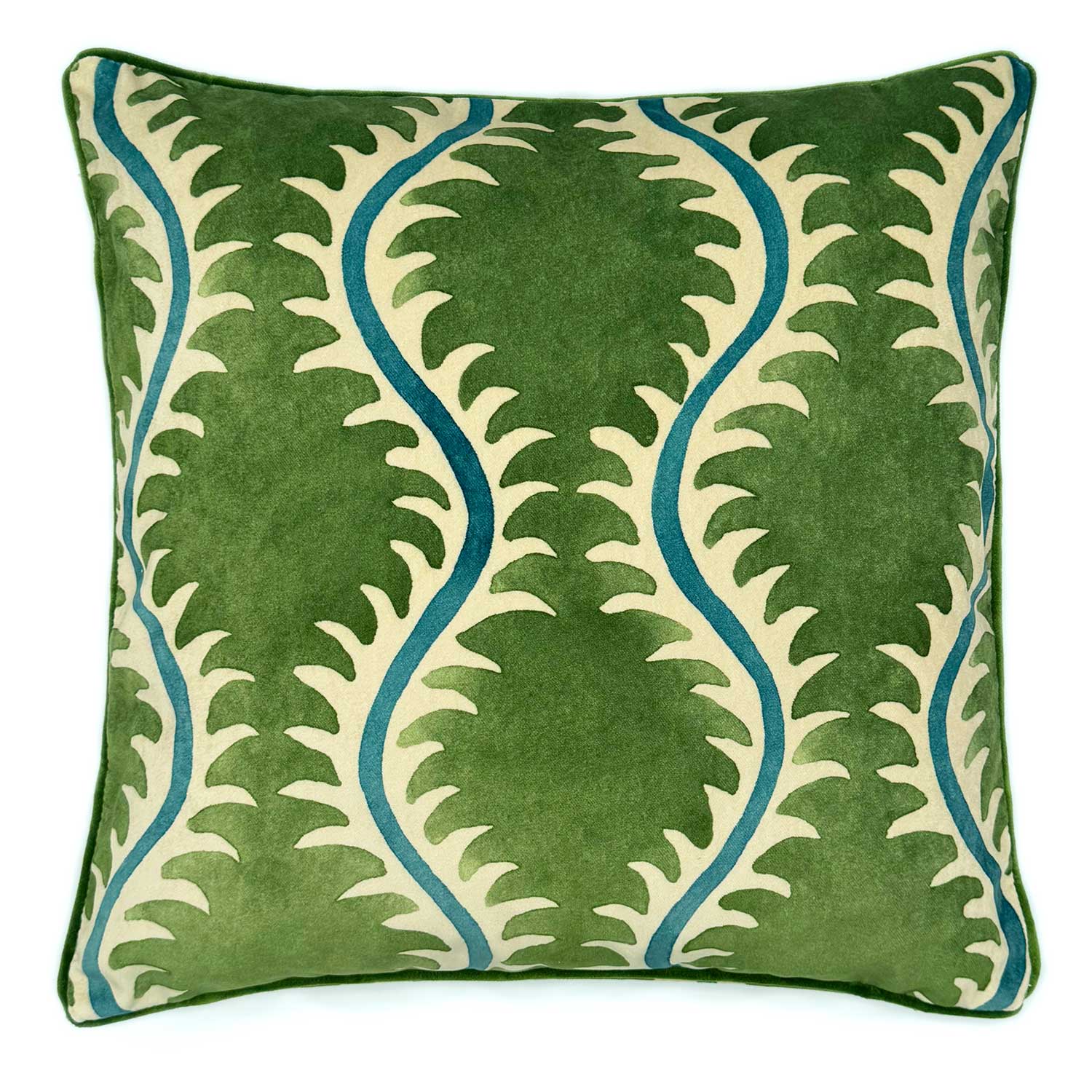 A sumptuous velvet cushion featuring a stylised fern pattern on both sides with co-ordinating piping. The perfect addition to your sofa, armchair or bed. All Linwood cushions come complete with a feather filled inner pad.