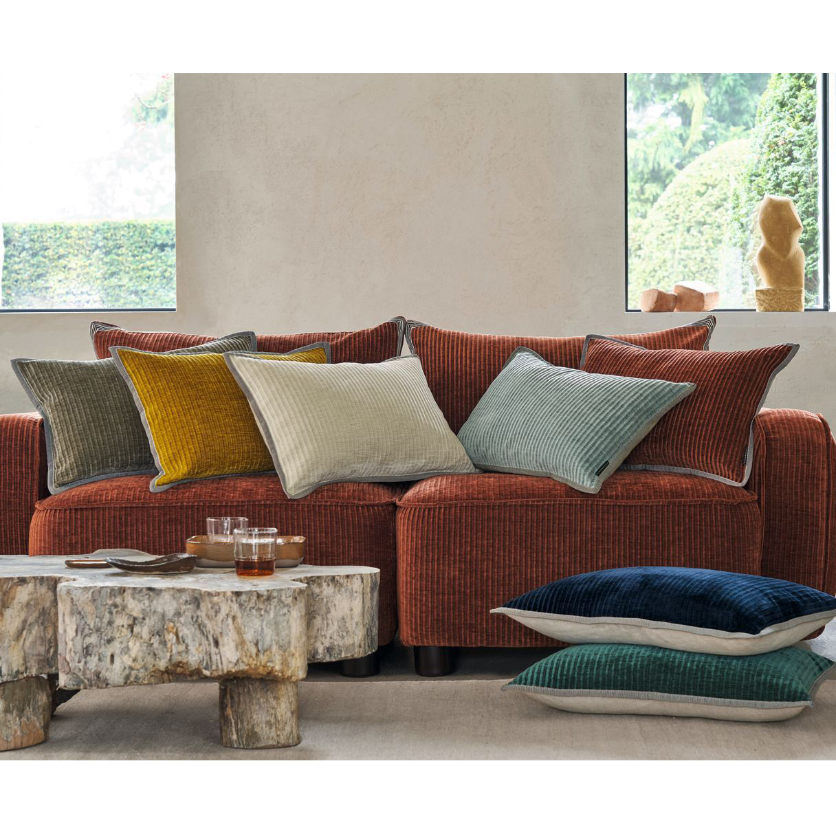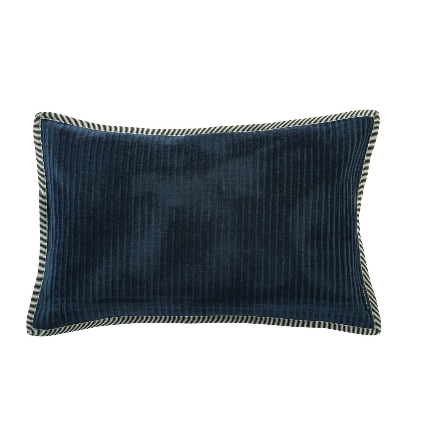 A large rectangular cushion in a luxurious, ribbed velvet. Co-ordinated with a natural coloured, plain linen on the reverse and braided piping. All Casamance cushions come complete with a feather filled inner pad.