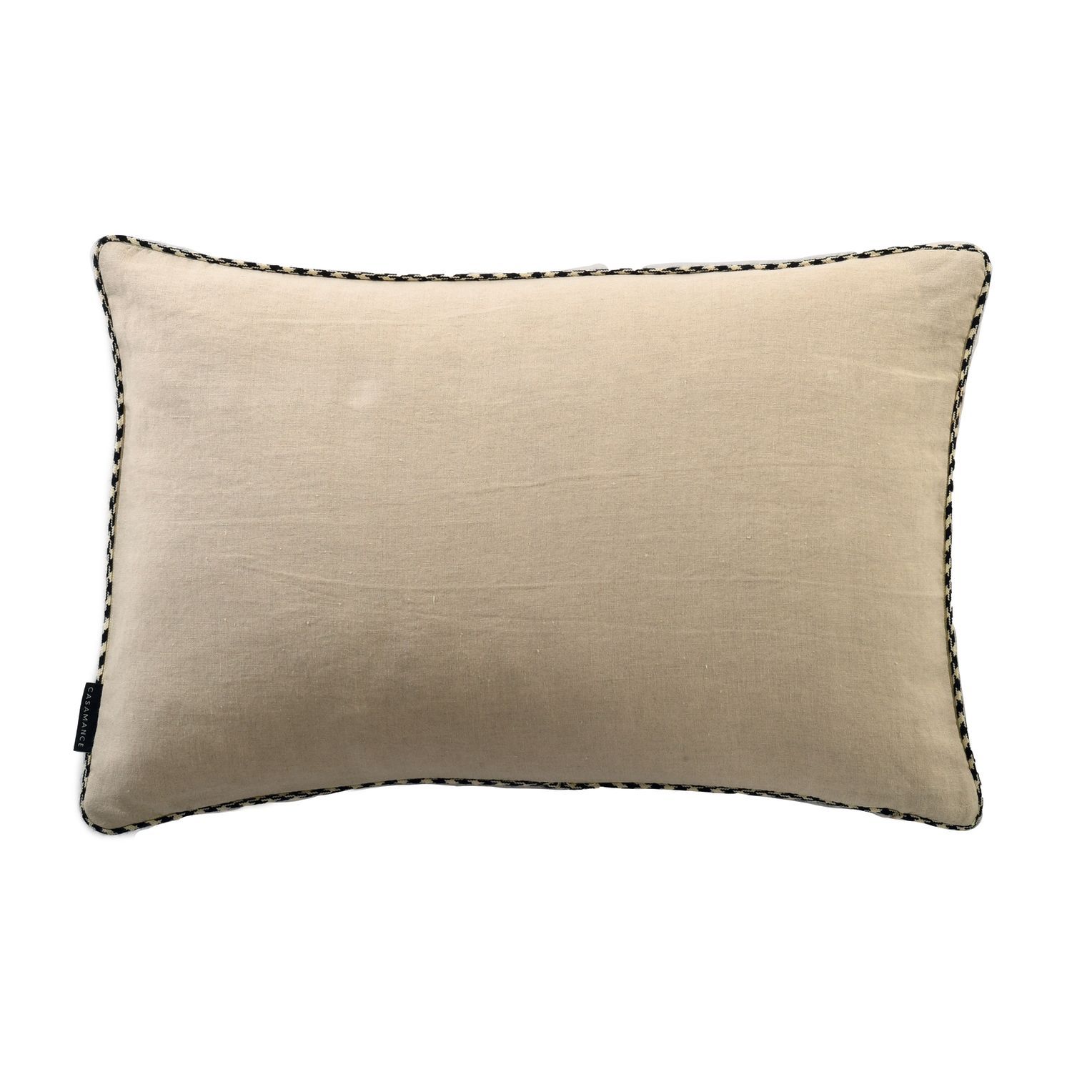 A large rectangular cushion with a patchwork of velvet, linen and textural ribbed fabric. Co-ordinated with a natural coloured, plain linen on the reverse and braided piping. All Casamance cushions come complete with a feather filled inner pad.