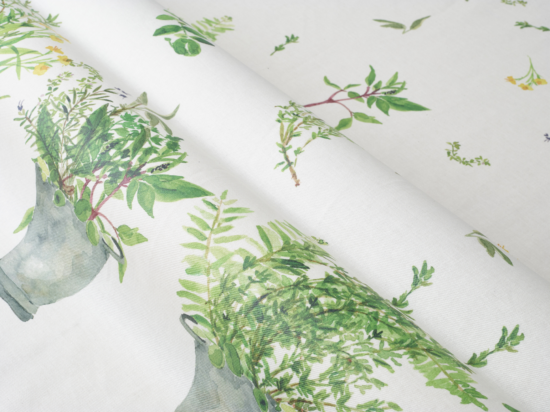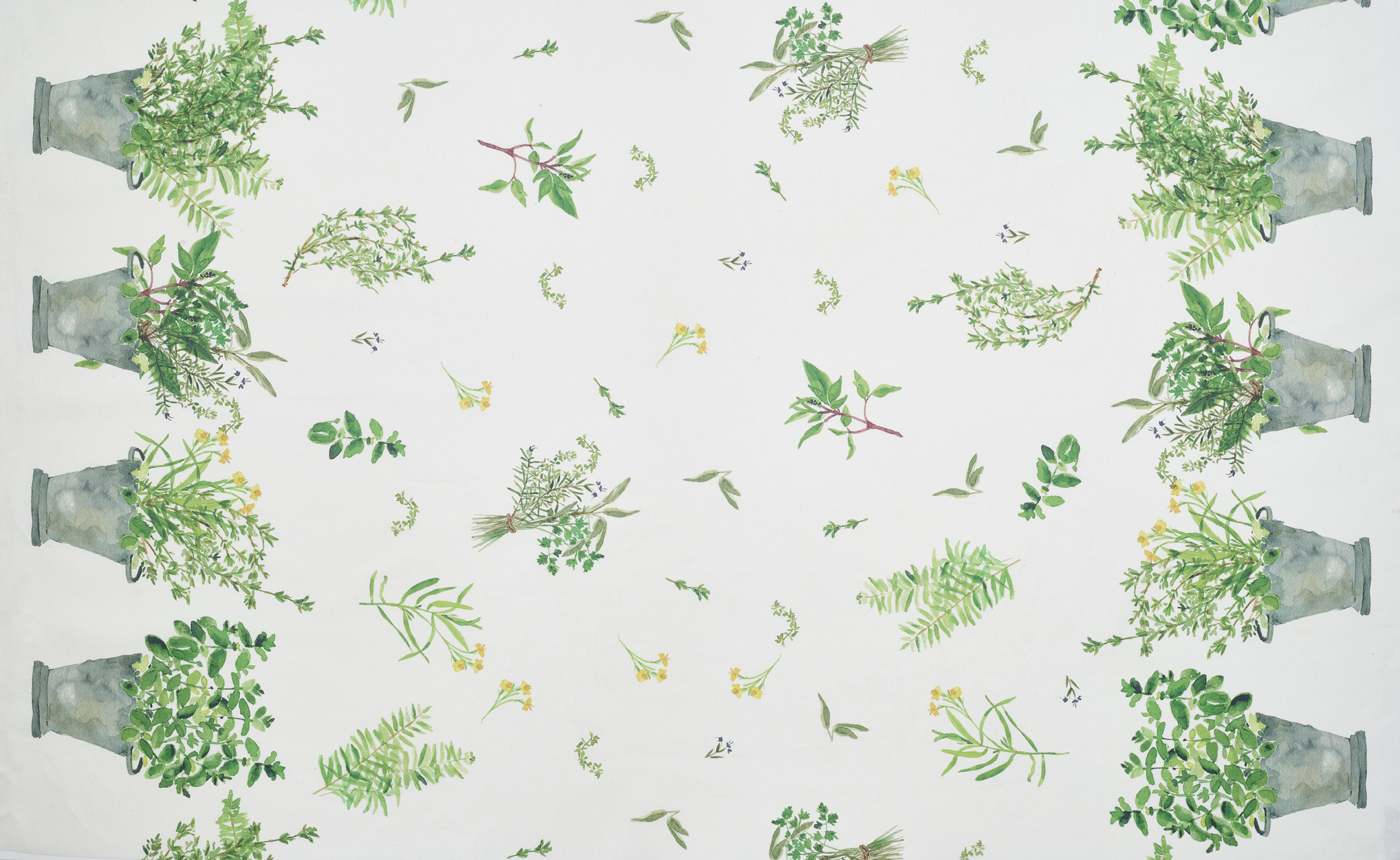 A coated, cotton fabric suitable for tablecloths with a stylish, herb garden design. This wipeable fabric has an acrylic coating which make the fabric water repellent and prevents most stains from penetrating the fabric.