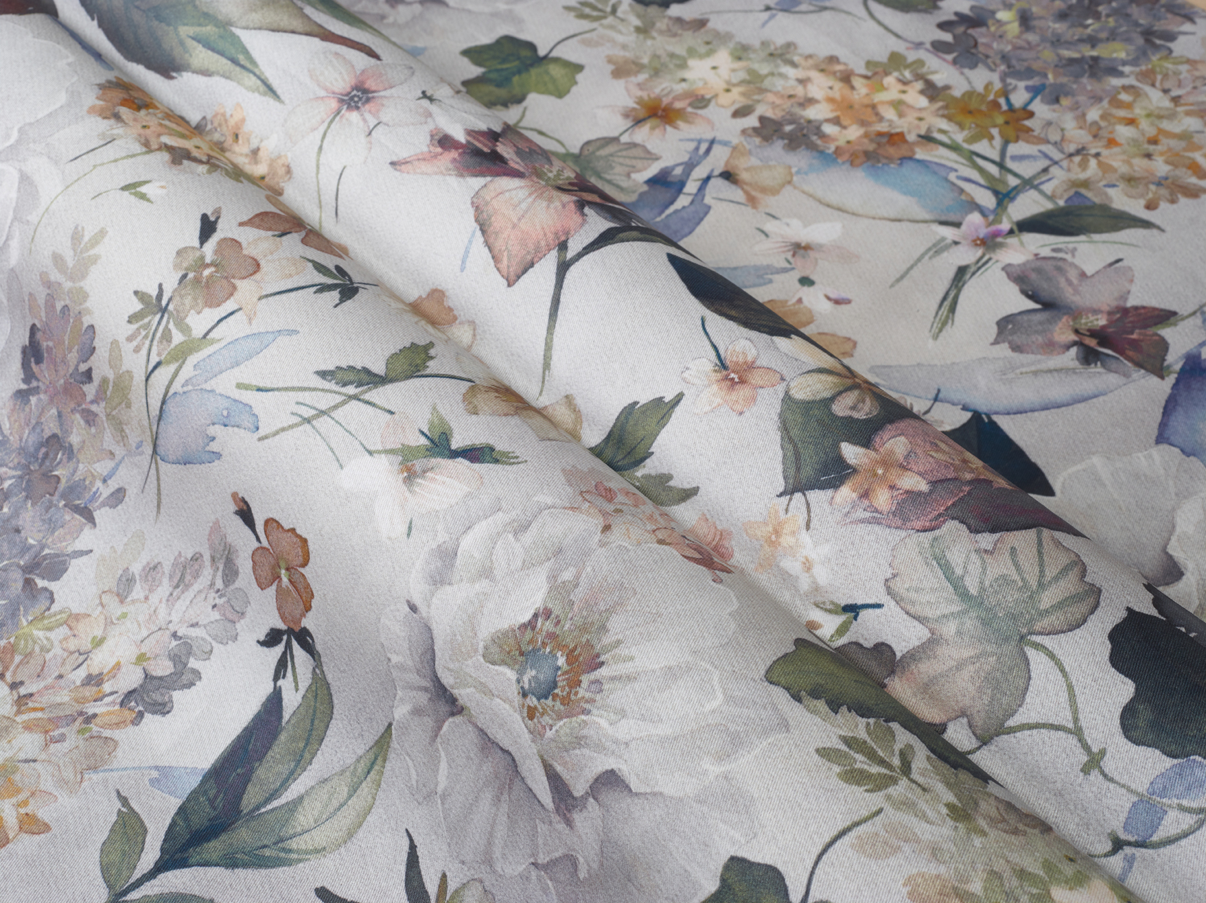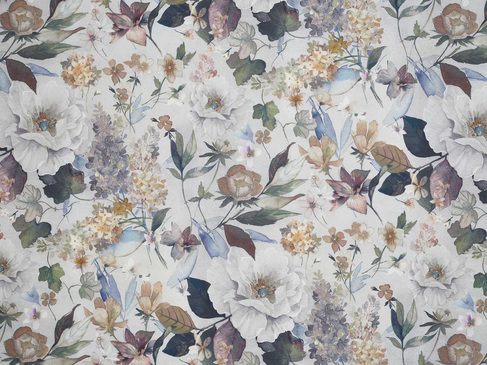 A coated, cotton fabric suitable for tablecloths with peonies and lilacs in painterly tones. This wipeable fabric has an acrylic coating which make the fabric water repellent and prevents most stains from penetrating the fabric.