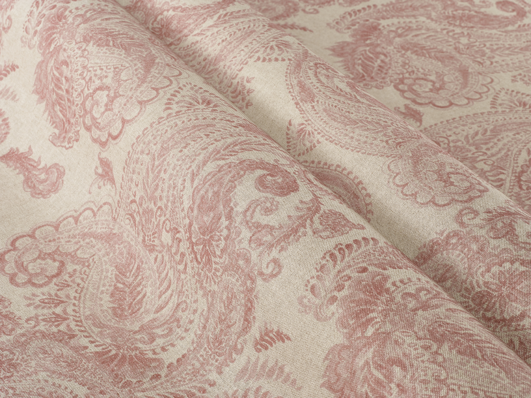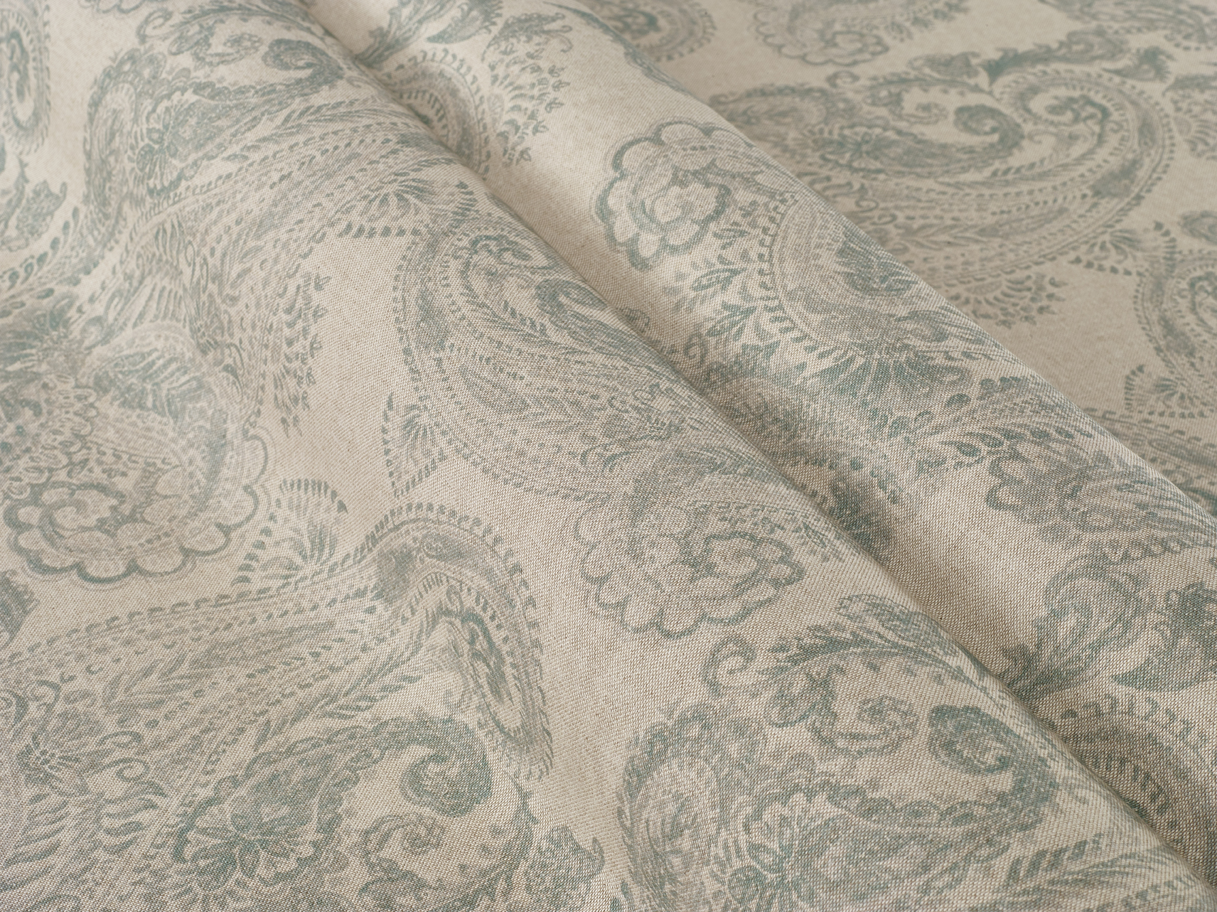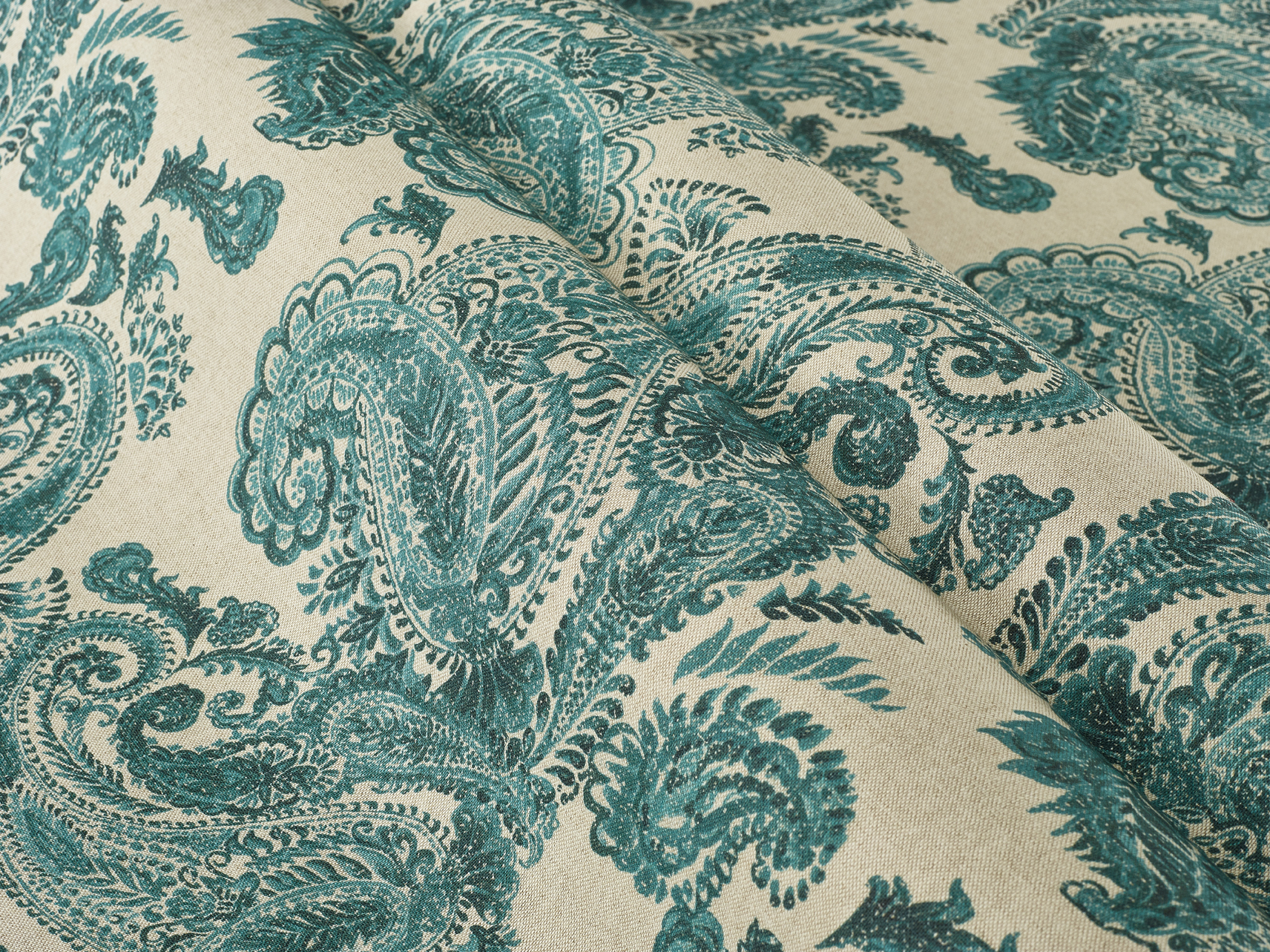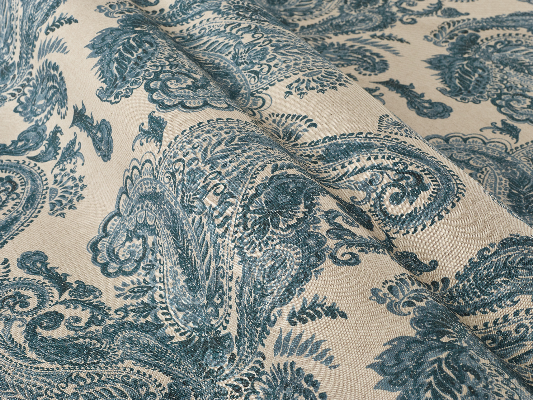 A large paisley design in a soft, painterly style. The larger motif on this print lends itself well to larger curtains and binds.