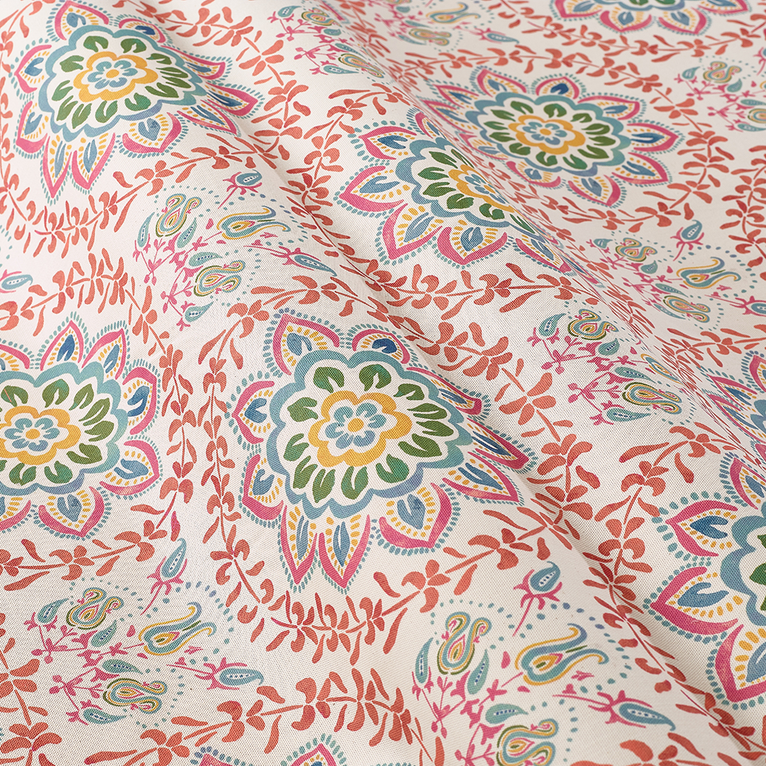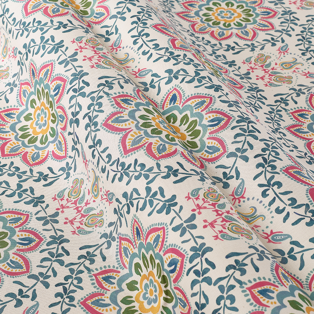 An Andalusian inspired design featuring stylised flowers and foliage in a geometrically repeating pattern. Wonderfully striking and suits modern and period interiors alike.