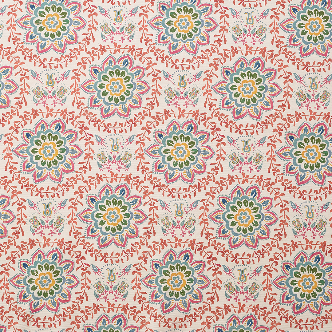 An Andalusian inspired design featuring stylised flowers and foliage in a geometrically repeating pattern. Wonderfully striking and suits modern and period interiors alike.