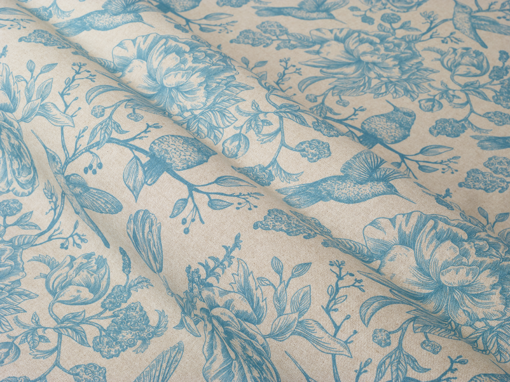 A joyful and bold print featuring hummingbirds and flowers on a natural coloured, linen-look fabric.
