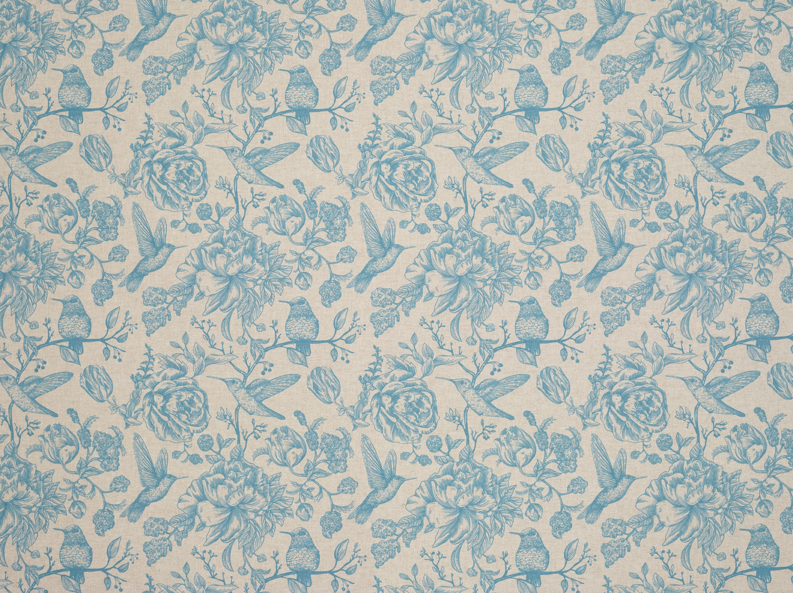 A joyful and bold print featuring hummingbirds and flowers on a natural coloured, linen-look fabric.