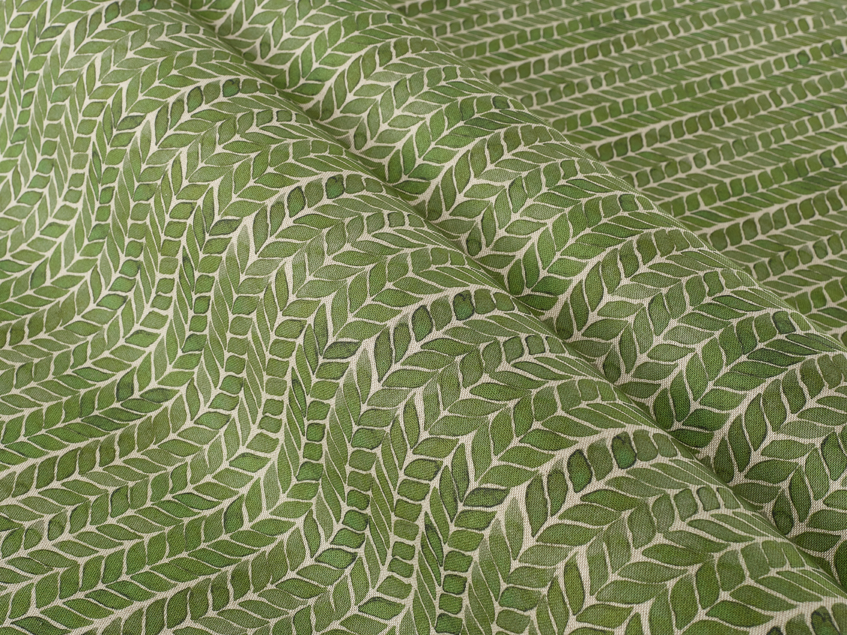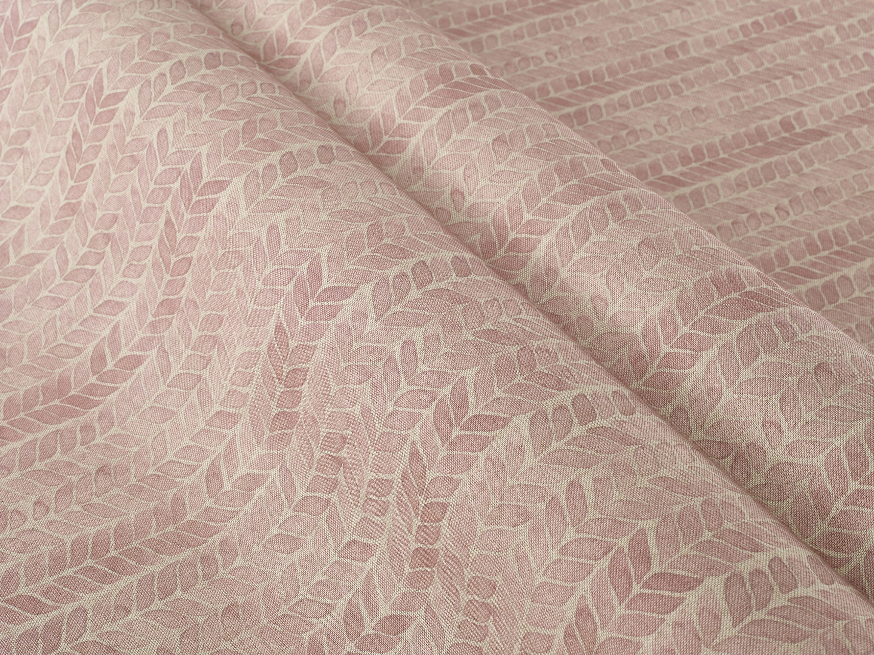 A simply repeated leaf motif in a soft, painterly style. The small-scale pattern lends itself particularly well to cushions and smaller blinds and curtains.