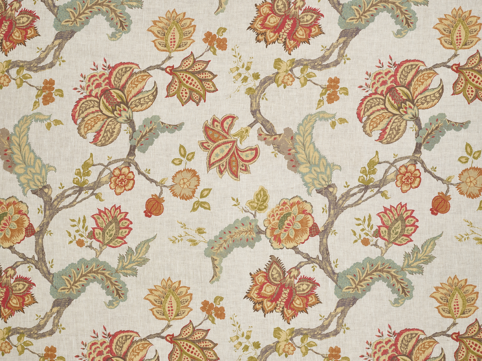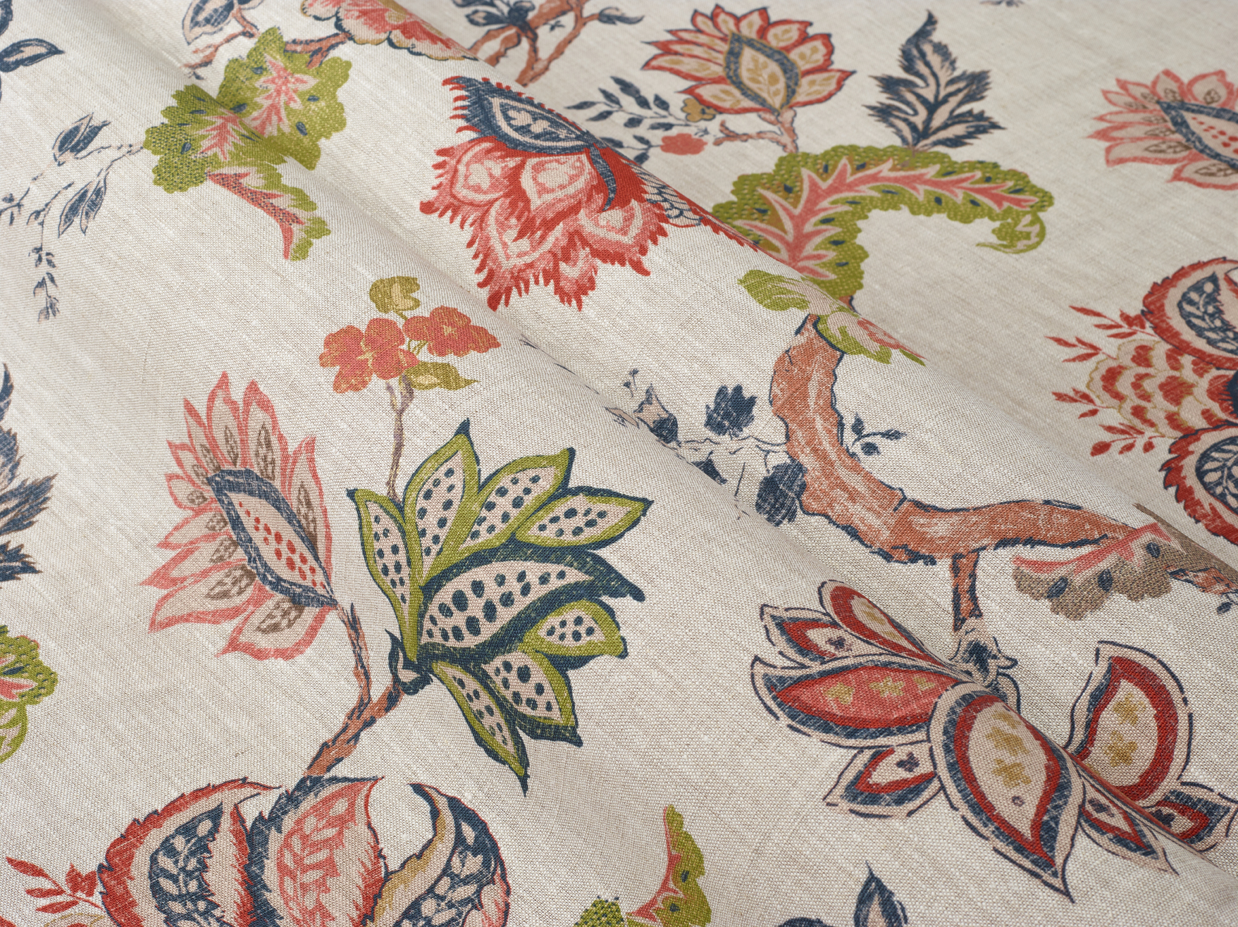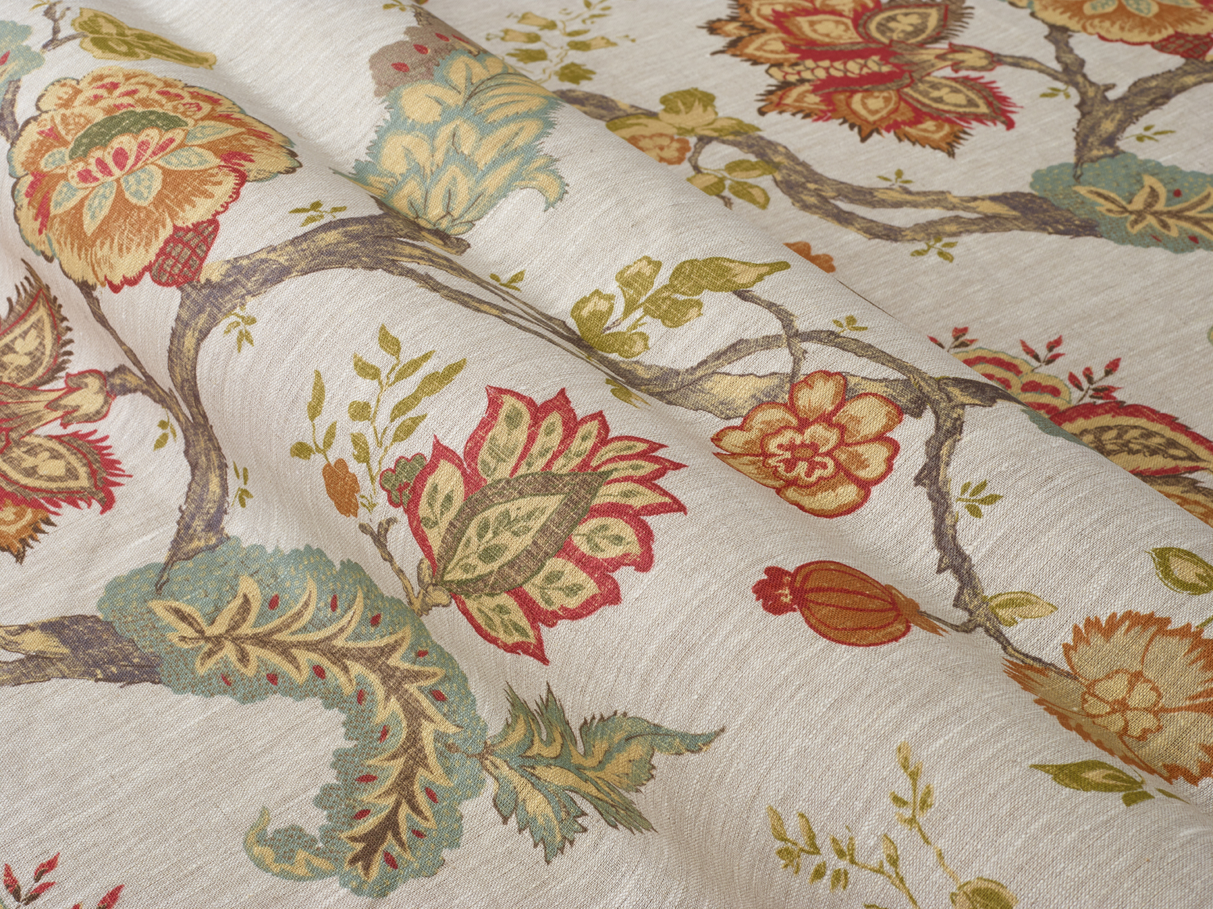 A fabulous floral design printed on soft, 100% linen. The large-scale pattern repeat lends itself well to larger curtains and blinds.