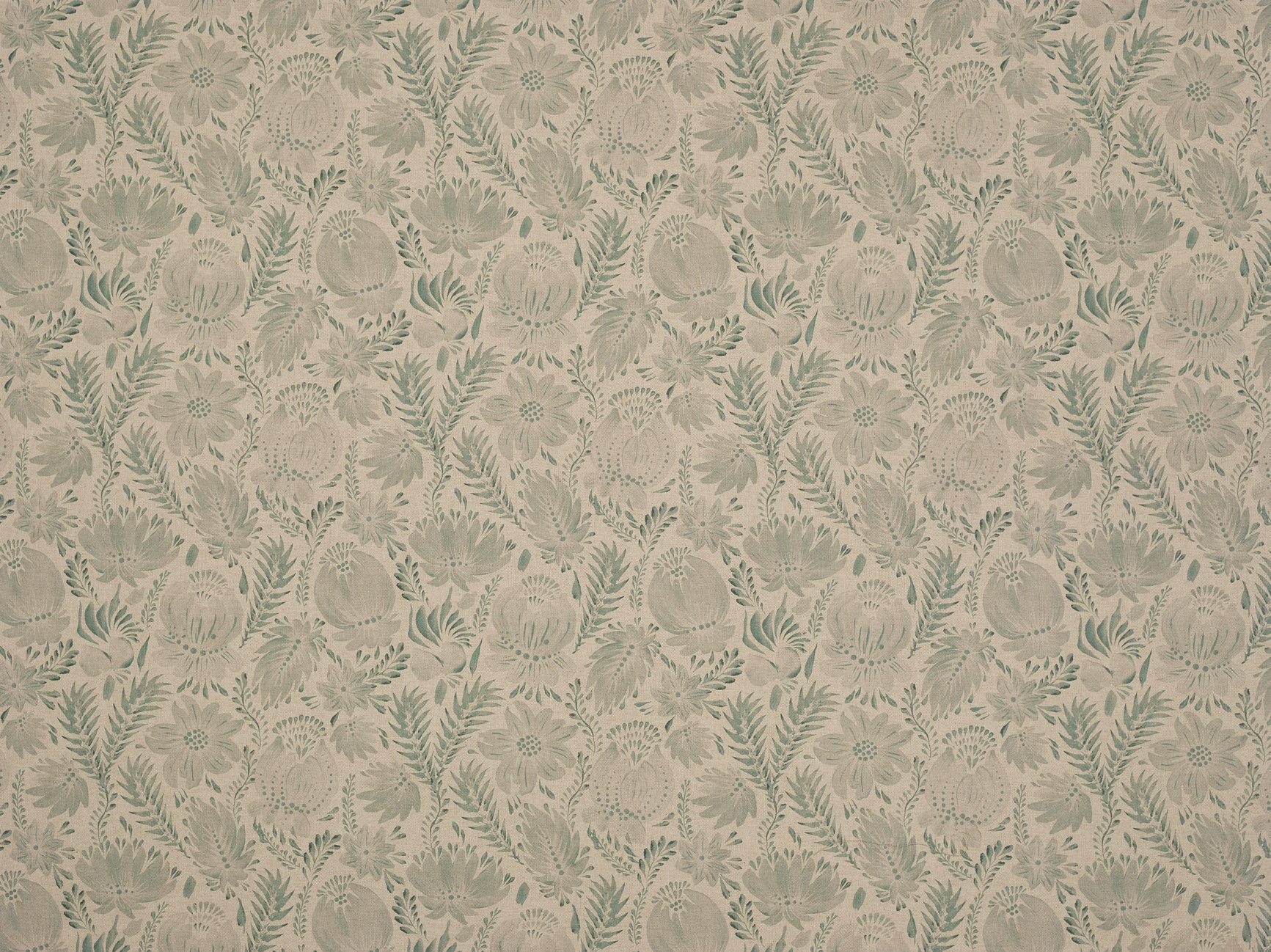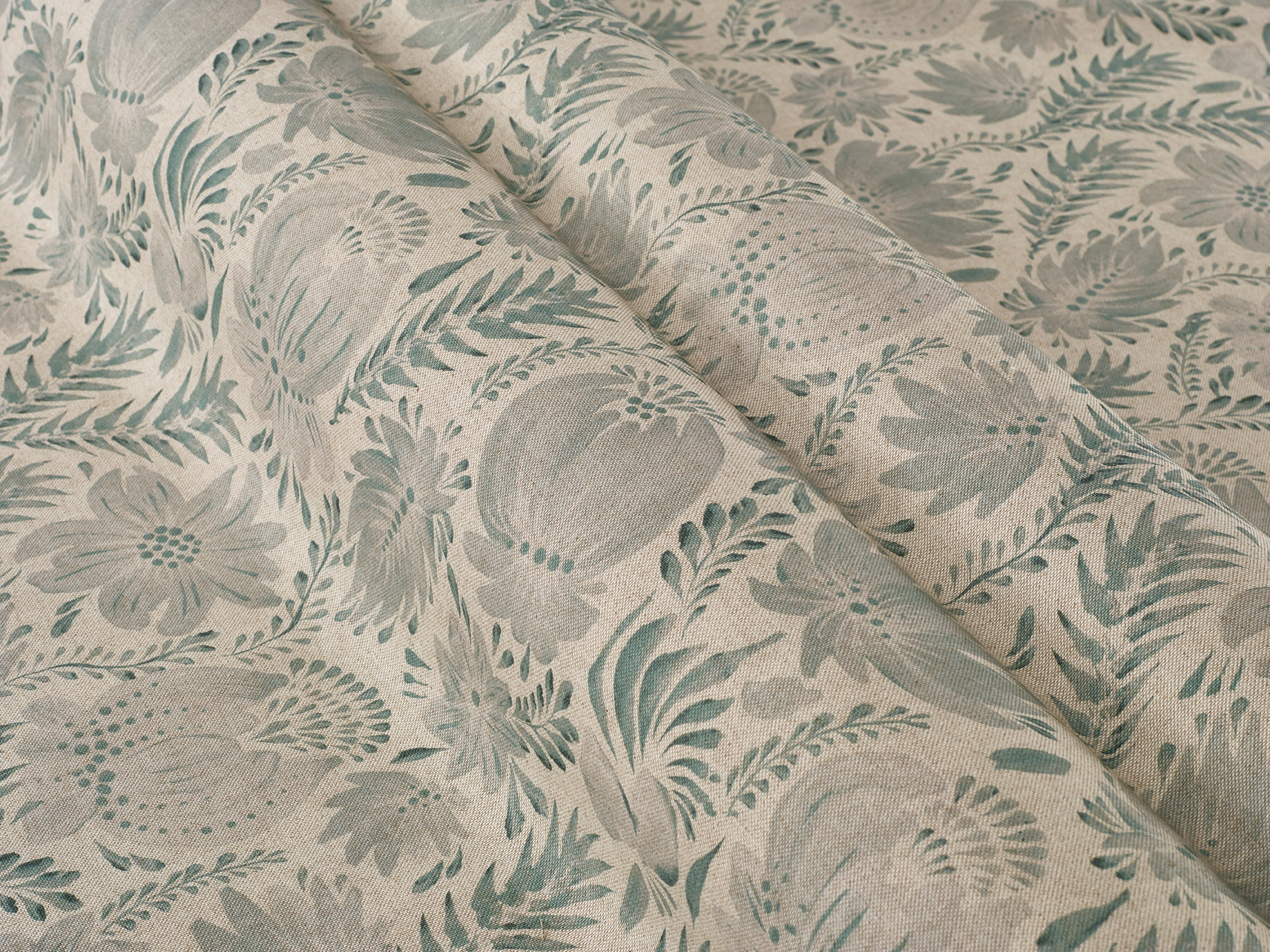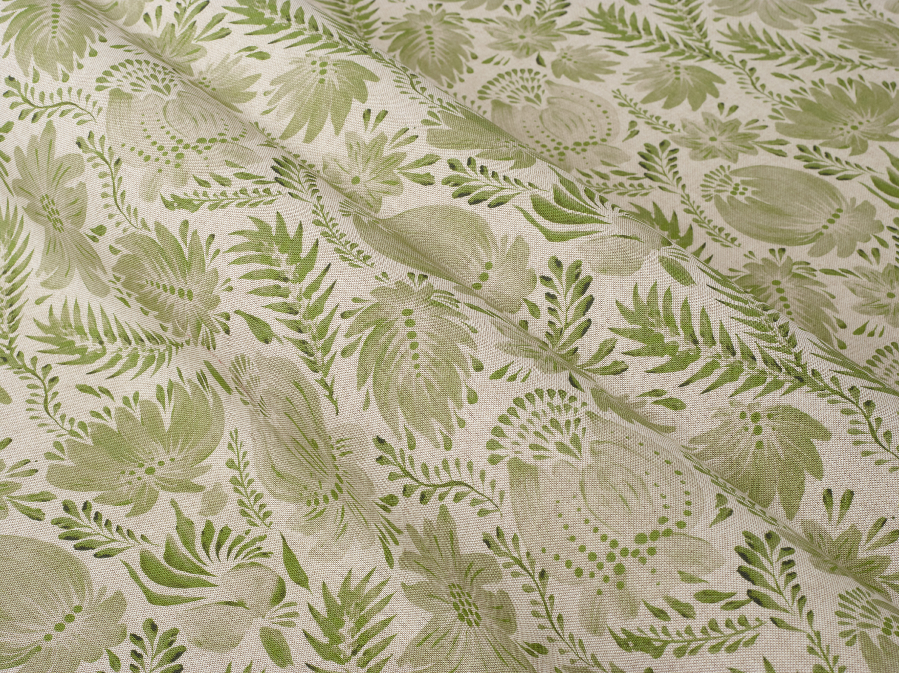 A soft, painterly botanical print on a natural coloured, linen-look base cloth.