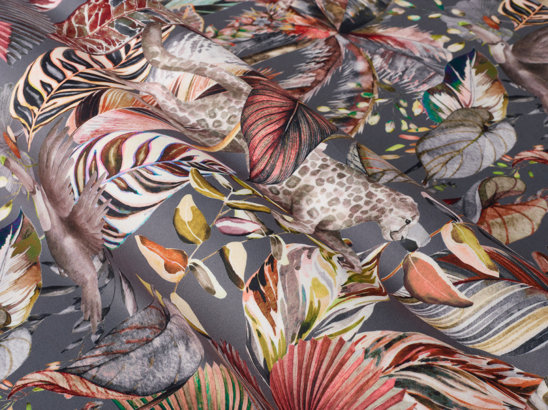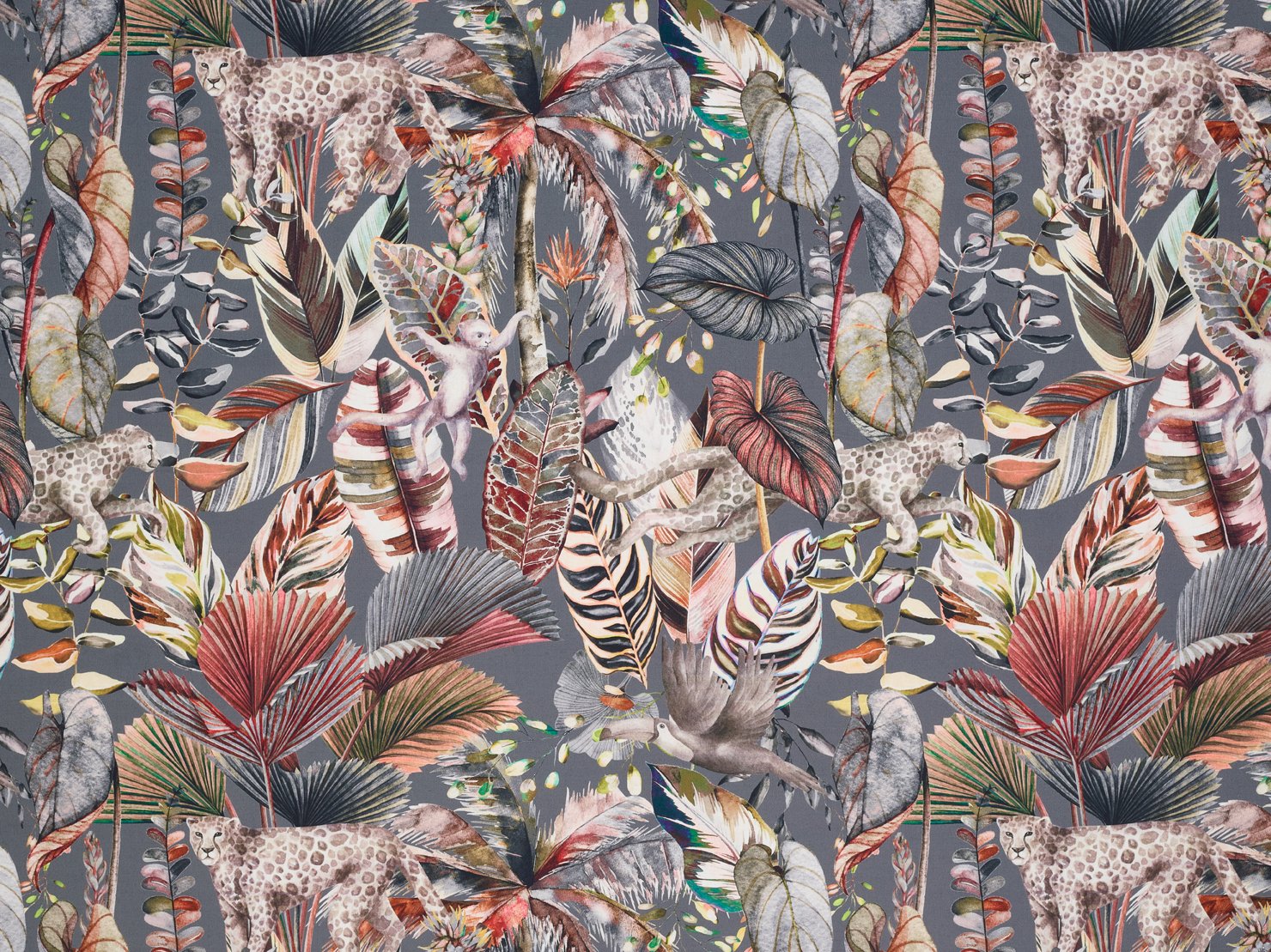 A velvet fabric with a large scale, contemporary jungle print featuring monkeys and leopards.