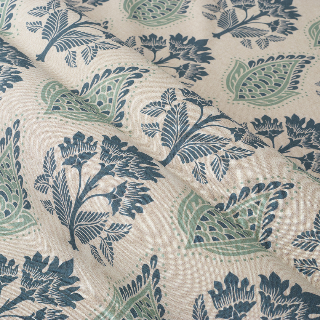 A stylised flower and leaf motif in a closely repeated pattern, printed onto a natural-coloured base cloth. Smart and stylish. This is the larger scale version of this design. Also available as a smaller scale pattern (Taversham Small).