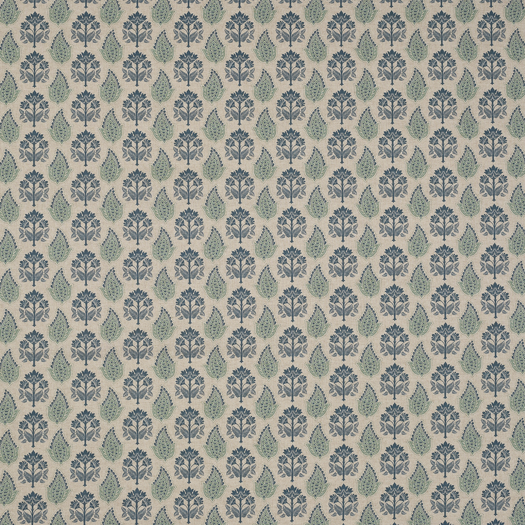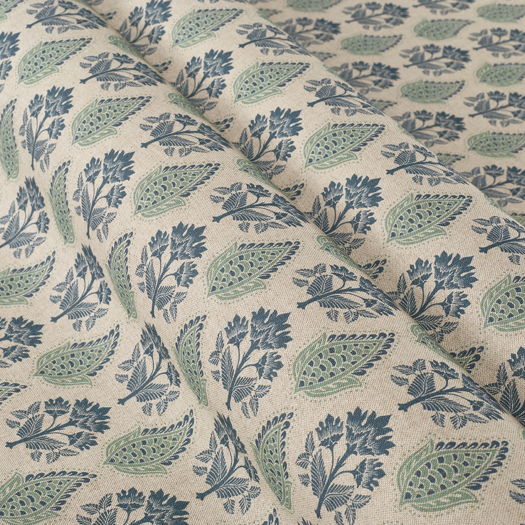 A stylised flower and leaf motif in a closely repeated pattern, printed onto a natural-coloured base cloth. Smart and stylish. This is the smaller scale version of this design. Also available as a larger scale pattern (Taversham Original).