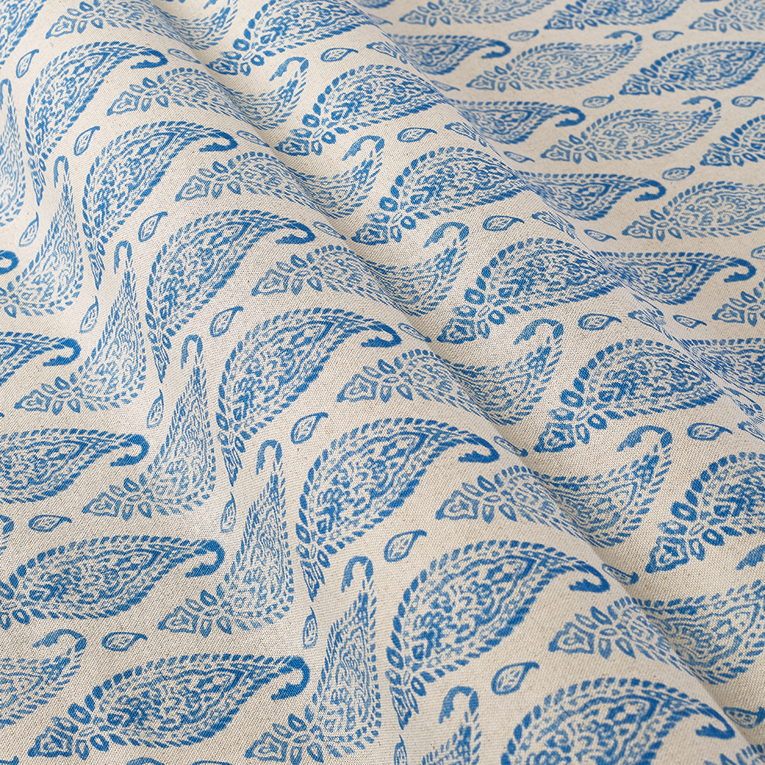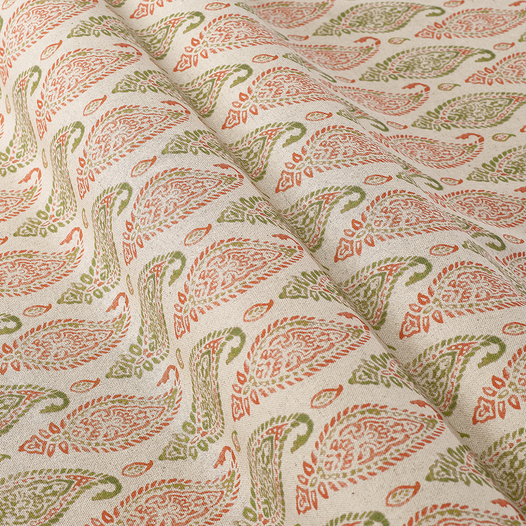 A super stylish design featuring a paisley motif on a natural coloured, linen mix base cloth.