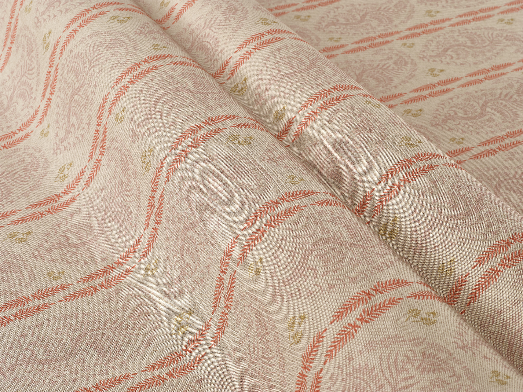 A larger scale striped design featuring stylised foliage printed on a natural coloured, linen-look base cloth. This design is also available on a coloured background (see Estella Stripe) and a cream background (see Estella Sripe II).