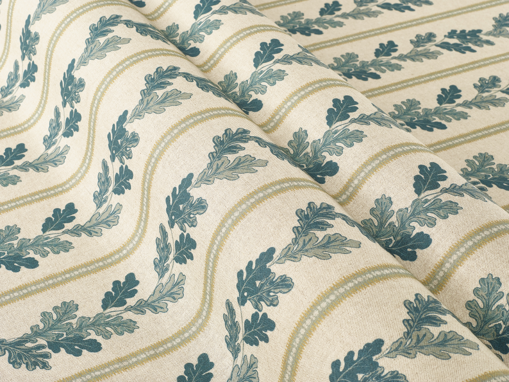 An elegant stripe with a trailing oak leaf motif on a natural coloured, linen look fabric. Looks equally at home in a modern or period interior. Add a contrasting plain border for a smart looking roman blind for example.