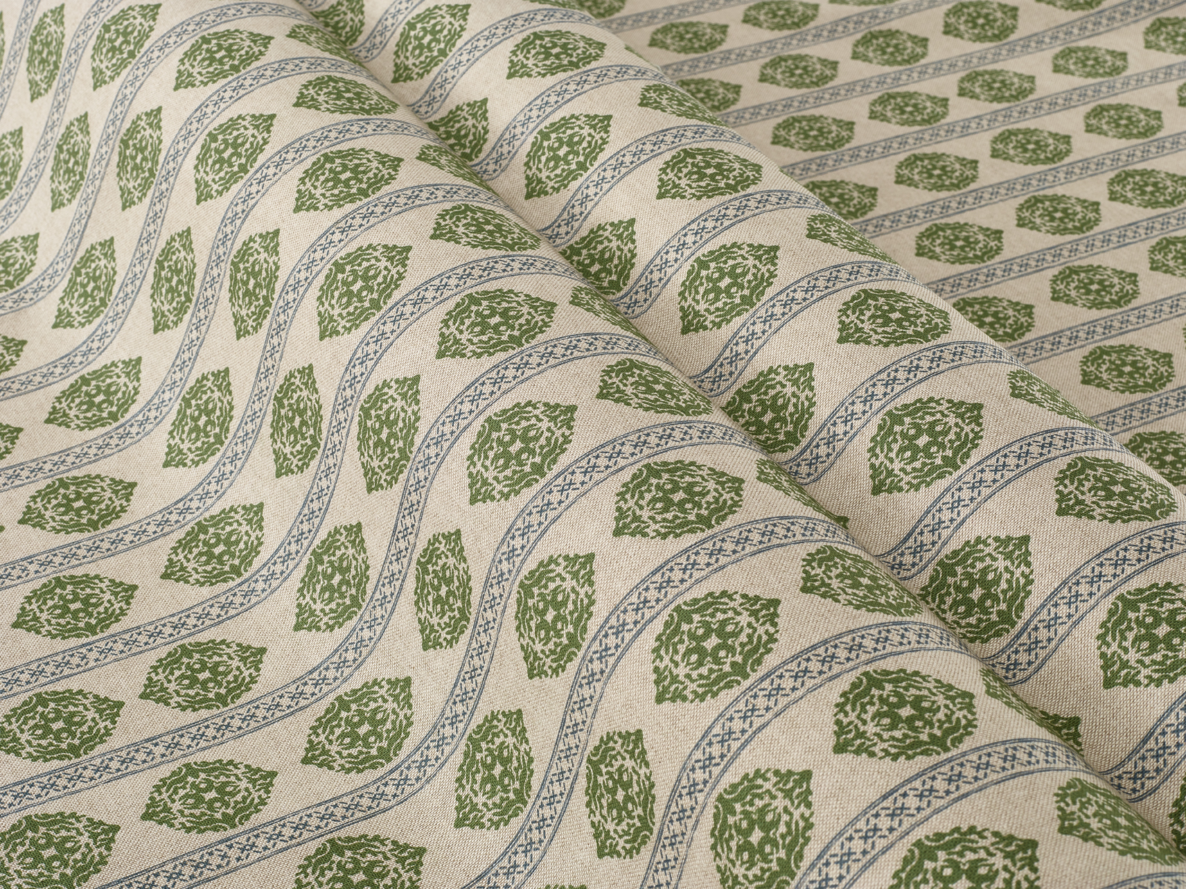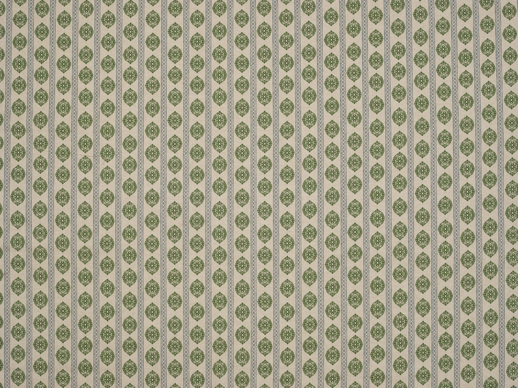 A block print style motif with a vertical stripe printed onto a linen look base fabric. Beautifully smart and stylish.