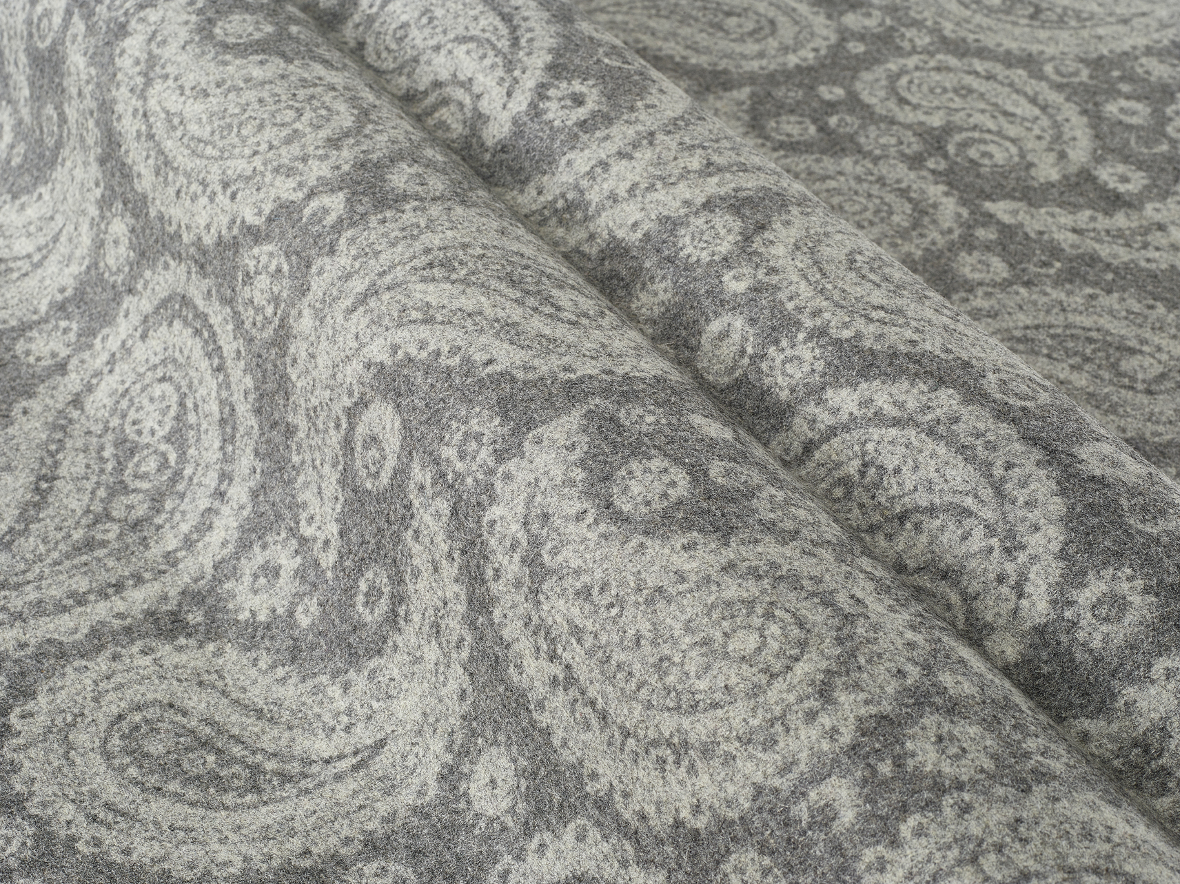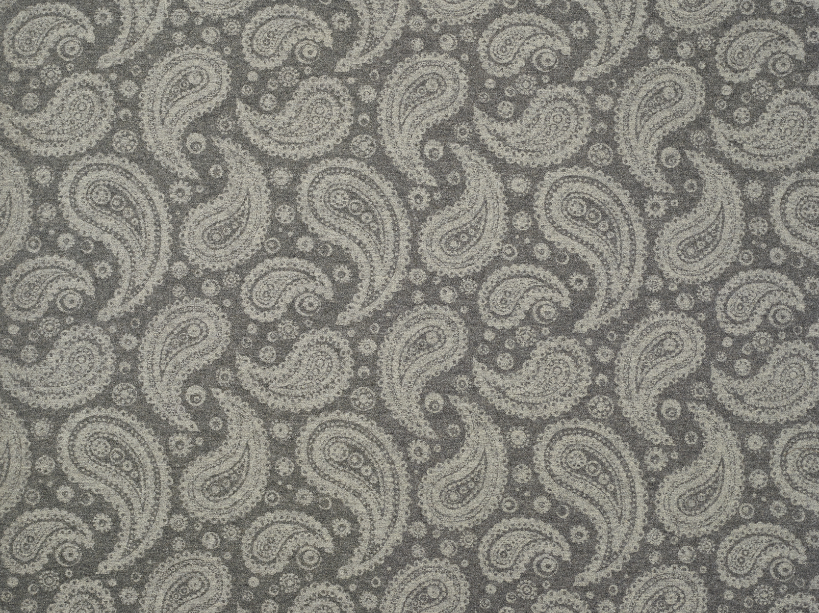 A woven fabric featuring a classic paisley design. Made from melange dyed Shetland wool. Naturally flame retardant and fully reversible.